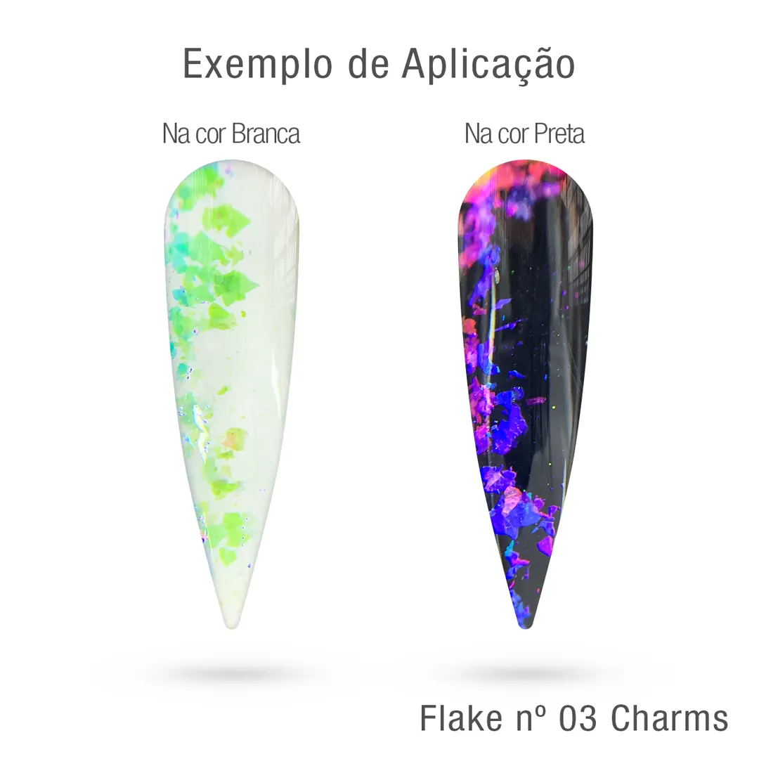 Aplicação: Os Flakes são aplicados sobre o esmalte ou a base ainda úmido , geralmente com o uso de um pincel ou espátula delicada. Eles aderem facilmente à unha, criando um efeito de brilho instantâneo.